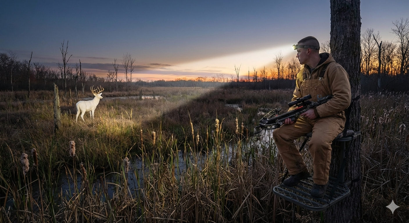 2024:  A white buck in a Wisconsin marsh passes by a hunter’s tree stand.  It is illegal to shoot white deer in Wisconsin and it is illegal to hunt after dark.  The story that follows should have been major news, but it wasn’t.  What happened?  AI image by Protect the White Deer.